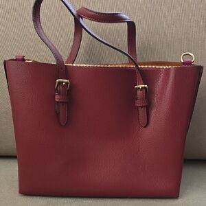 Chic Coach Mollie 25 tote with a luxurious burgundy exterior with burnt orange interior. Features elegant gold accents. Perfect for everyday style. Please note it does not come with the crossbody strap.