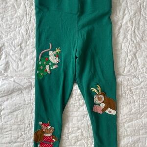 Striped red dress with embroidered Christmas tree, similar to Mini Boden but not branded. Has small mark on sleeve as indicated in photo that has not been stain treated. Mini Boden Christmas leggings with embroidered woodland animals in Holiday clothes. Stock up for next season!
