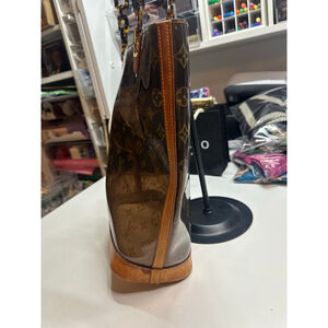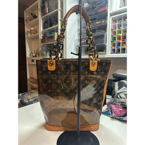 This pre-owned Louis Vuitton tote bag features a clear PVC body with the iconic brown monogram pattern, complemented by tan leather trim and a sturdy base with four protective metal feet. The handles are a combination of tan leather and tortoise-shell style acrylic chain links. Visible wear includes scuffs and discoloration on the leather base and trim, as well as some surface scratches on the PVC. The interior shows some marks and a "LOUIS VUITTON PARIS made in Spain" stamp on a leather tag.