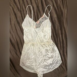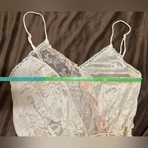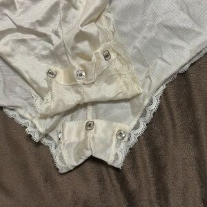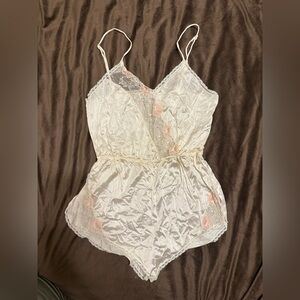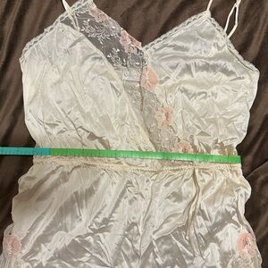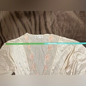 Luxurious cream peignoir and chemise set with floral lace in soft pastel pink and taupe details. Lightweight 100% Antron III nylon with that classic silky vintage feel. The chemise features flattering side slits up to the waist, adjustable shoulder straps, and operable snaps at the crotch. The short robe includes both an inner tie and a wider outer sash tie.