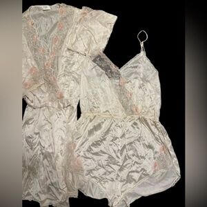 Rare VTG 70s Sans Souci Ivory Satin Lace Chemise & Robe Set 34/M Bridal