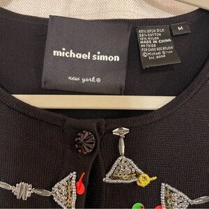 The absolute cutest sweater! Bejeweled and beaded martini cocktail glass all over. 65% spun silk with a cotton and nylon blend. Beautiful eye catching sweater, very good gently used condition