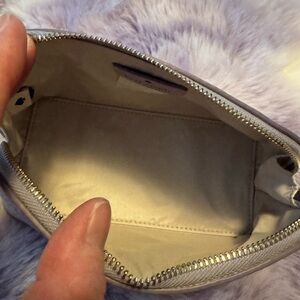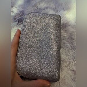 Dazzling silver cosmetic bag. Ideal for chic organization. Elevate your style effortlessly. Brand new without tags. You can see in the photo she had her tag but doesn’t anymore. Lots of room and would go nicely with any purse. It’s purple glitter and she’s very sparkly. Glitter doesn’t come off. Tested already just to see in a purse a I own if that’s what your concerned about.