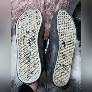 Black Vans skate shoes with white and red details. Ideal for skateboarding enthusiasts. Excellent pre owned condition, like new.