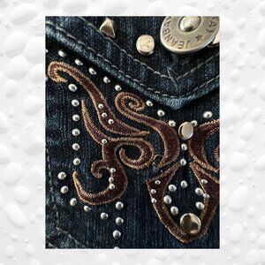 Step into timeless style with these jeans from Jeanbay. Featuring embroidery and studded back pockets, these jeans are a collector’s dream with a modern twist. These vintage-style women’s jeans in a classic blue denim with a mid-rise fit. Made from a mixture of ramie, cotton, polyester and spandex blend fabric, they offer comfort and stretch for everyday wear. The jeans are in excellent condition.