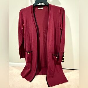 Stay stylish and warm with this elegant burgundy cardigan. Perfect for layering, this piece adds a touch of sophistication to any outfit.71% Rayon, 29% Polyester. Pit to pit 20, hangs 33.