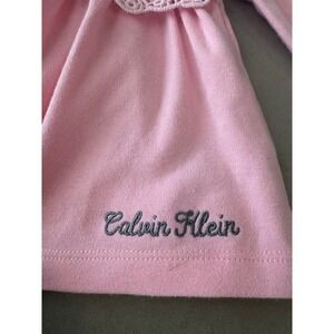 Calvin Klein baby girls pink long sleeve peplum top. Adorned with delicate crochet lace detailing across the chest and a charming embroidered Calvin Klein logo on the hem. The top features a button closure on the back for easy dressing and raglan sleeves.