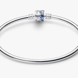 sleek sterling silver bangle is set with blue man-made crystals and clear and blue cubic zirconia up into the clasp. An elegant piece you’ll reach for over and over again.