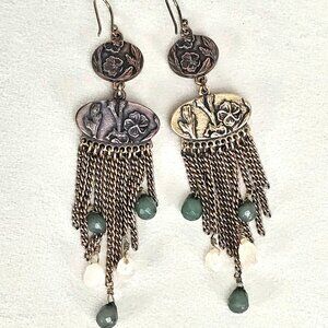 Lucky Brand Antiqued Brass Tiered Tassel Statement Earrings - Green Stone & Bead