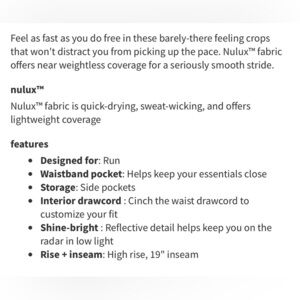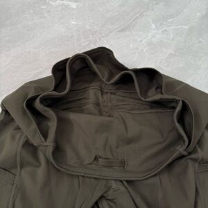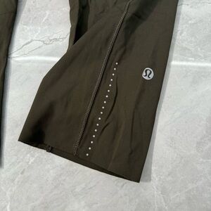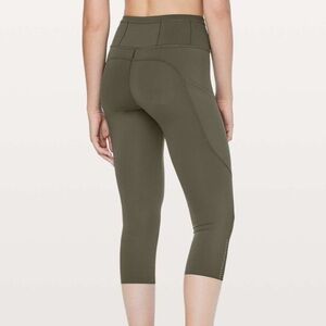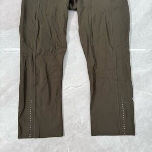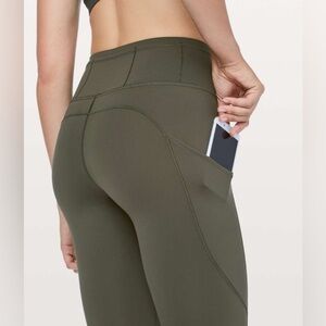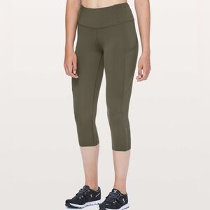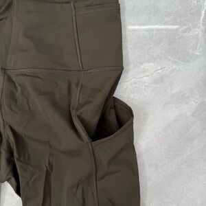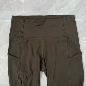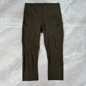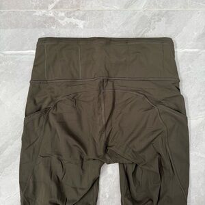 Good condition - Women’s Lululemon Fast & Free Crop II Nulux 19" Leggings With Pockets. Has five pockets in the waistband, drawstring in the waistband, two side pockets, and 19” inseam. No tear away tag present, but size dot is present. Color: olive/army green. Size: 6.