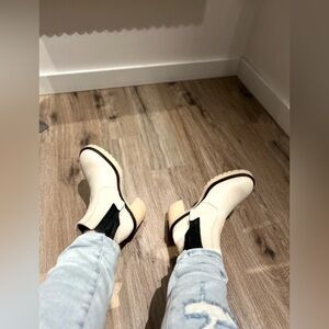 Make a statement in these so cool leather Chelsea boots featured in a chunky heeled design with elastic side details and a slim silhouette. These boots feature intentionally distressed detailing for a worn-in look.
