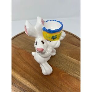 K's Collection White Bunny Rabbit Egg Cup Holder Yellow Blue Floral Design