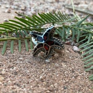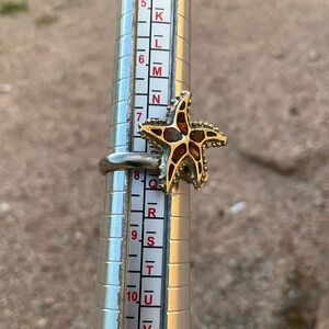 Cute Mexican starfish ring with dark opal inlay. Stamped on inside of band. Rests at a ring size 8, but is adjustable.