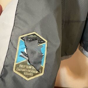 This is a Columbia Watertight II rain jacket in gray and light gray with Omni-Tech waterproof/breathable fabric. In good preowned condition. See small white spots on sleeve and one side of jacket. Interior label is not in tact. See in pic. Packable.