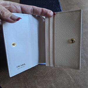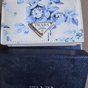 Elegant Prada wallet with floral design. Cream and blue tones. Ideal for carrying essentials.