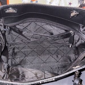 Elegant Michael Kors tote with iconic MK pattern. Features chain-link handles and signature charm. Perfect for everyday use.