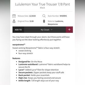 Lululemon Black Your True Trouser 7/8 Pant Size 6