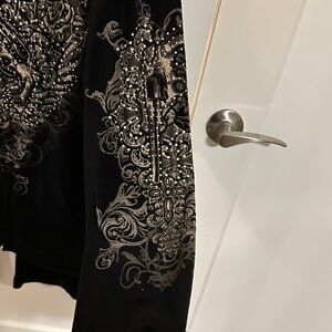 Velour set with rhinestone embellishments and rose decor. Waist band is slightly twisted, as shown in pics, but can be smoothed out. Bottoms are low rise.