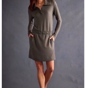 Elegant gray dress with long sleeves. Features a stylish collar and button details. Perfect for any occasion.