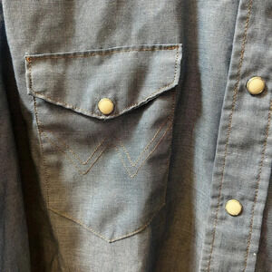 VTG Wrangler Mens Western Blue Brushpopper Shirt X Long Tails Pearl Snap USA.