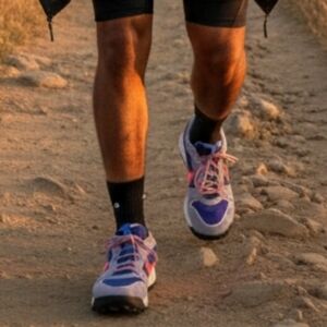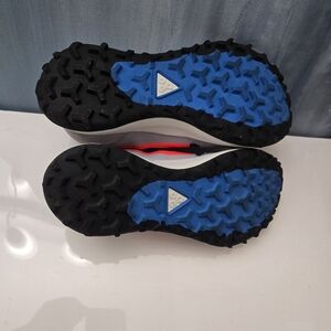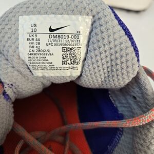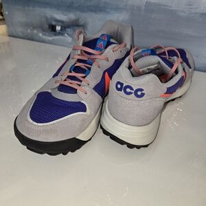 Nike ACG sneakers grey with a vibrant purplish blue and red design.