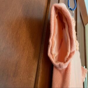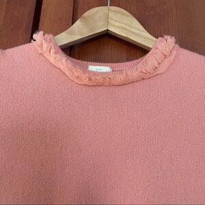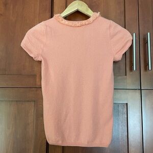 Peach short sleeve sweater from J.Crew. Ruffle detail around the collar. Sleeves are lined with chiffon type fabric.