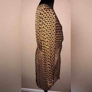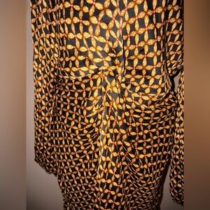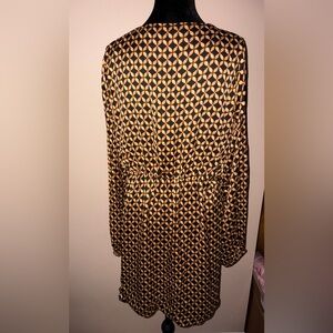 Stylish mini dress with geometric pattern. Features long sleeves and a wrap design. Perfect for a night out.