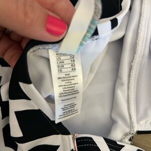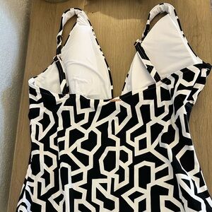 Make a statement with this stylish black and white geometric swim one piece. Perfect for a modern beach look.