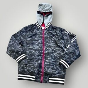 Stylish 365Kids from Garanimals hooded zip up jacket with black & gray camouflage design, red inner lining. Bright shiny silver GAME ON written down the left arm as shown. Perfect for the upcoming fall weather! Excellent preowned condition, barely worn. See details and measurements in photos!