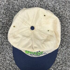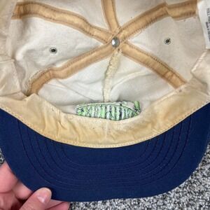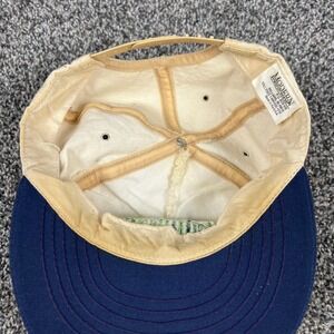Retired Postal Worker embroidered cap featuring "No More Snow No More Hail I'm Retired You Deliver the Mail" quote. This hat has a beige crown and a navy blue brim with lime green embroidery in a western font. Super sick hat. The interior shows a tag from Modern Process Company. Unique, one of a kind.