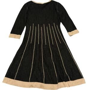 Nine West sweater dress with black knit body and tan contrast trim. Features 3/4 sleeves, scoop neckline, and fit-and-flare cut with vertical stitch detail. Approx flat lay: pit to pit 16”, length 37”. Size Small.