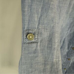 Light blue tunic shirt from Tahari in 100% linen. Button front, button cuffs with option to roll w/ sleeve tab. Split hem, French seams at hips.