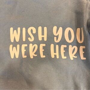 Comfortable light blue crewneck with a cheerful smiley face and 'Wish You Were Here' text. Ideal for casual wear.