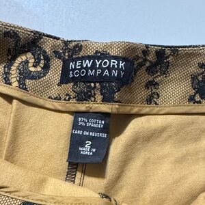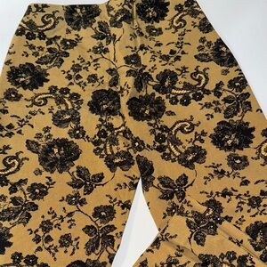 Elegant pants with intricate black floral design on a tan base. Ideal for a sophisticated outfit.