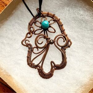 Elegant turquoise and copper pendant necklace featuring intricate floral details. Perfect for adding a touch of color to any outfit.