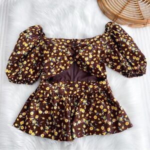 Autumn Adeigbo Bridgette Puff Sleeve Cut-Out Top Brown Yellow Floral Peplum