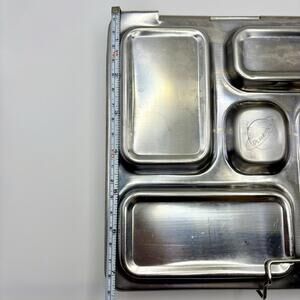The PlanetBox Rover Stainless Steel Metal 5 Compartment Bento Lunch Box is a durable and stylish lunch container perfect for storing and transporting meals. With a snap lid for easy access, this silver-colored lunch box is made from stainless steel and metal, ensuring long-lasting use. It features 5 compartments for organizing different food items and has dimensions of 7.5 x 10 inches. Some wear, see photos.