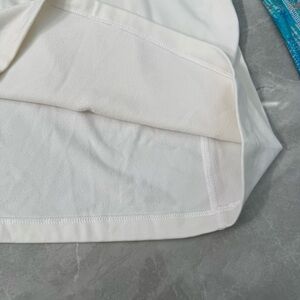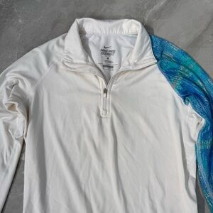 Good condition - Women’s Nike Pro Combat Therma Fit Fitted 1/4th Zip Jacket Pullover Long Sleeve. Has 1/4th zipper closure and thumb holes on ends of sleeves. Colors: white/cream, blues, and gray. Size: M.