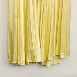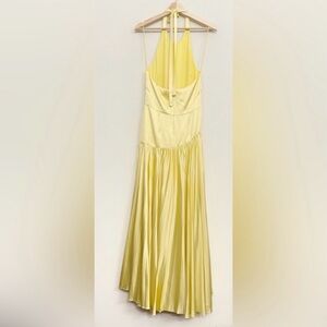 Chic yellow maxi dress with halter neckline. Features elegant pleated skirt. Perfect for stylish occasions.