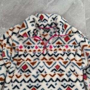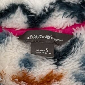 Good condition - Women’s Eddie Bauer Aztec Ultra Soft Plush 1/4 Zip Pullover Sweater. Has 1/4 zipper closure. Colors: white, pink, blue, and orange. Size: S.