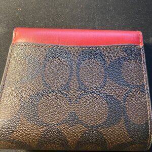 Women's COACH trifold wallet - burgundy accent on brown "C" signature