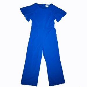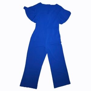 women's pants / blue women's jumpsuit with bell sleeves / a form fitting look and flared legs / size 10 / invisible zipper in black for closure / like new condition