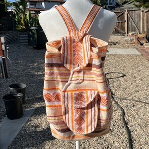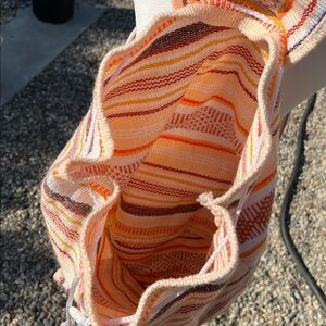 Stylish backpack with orange and white stripes. Features a drawstring closure and front pocket.