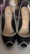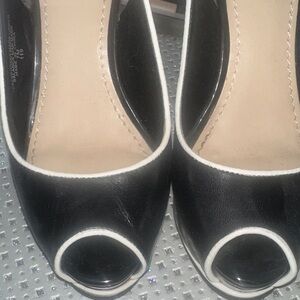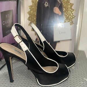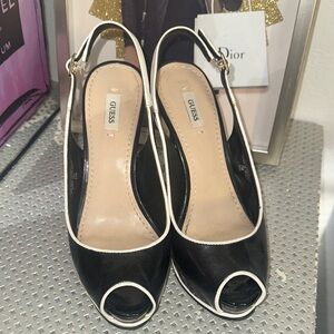 Chic Guess heels with a stylish peep toe design. Black with white trim for a classic look.