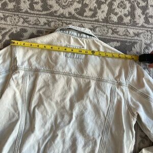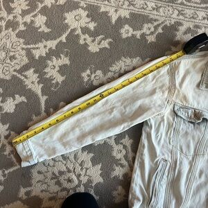 Forever 21 distressed light wash denim jacket. Small black speck on button line, small mark on sleeve that i honestly can’t tell if it’s part of the distressed look or not (see last two photos). 94% cotton, 6% rayon. Very lightweight, perfect for spring or fall.