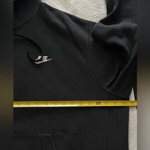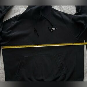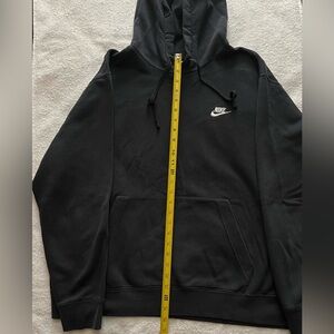 Men’s Nike Hooded Sweatshirt, Black, Size Extra Large, Pre-Owned, Excellent Used Condition with no rips or tears but it does have some slight discoloration due to normal wear and machine washing, has a hood with drawstrings, one large Kangaroo connecting pocket on the front as well as the embroidered Nike logo on the left front of chest, approximate measurements are in photos, available to answer any questions