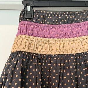 Chic polka dot skirt featuring stylish purple and tan accents. Perfect for any occasion.