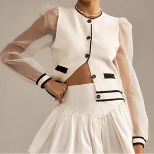 •Design: It features a button-front closure and sheer organza sleeves, as seen in the image.