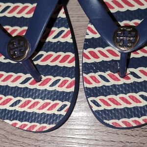 Tory Burch sandals with navy straps and red rope design. Ideal for casual outings.pre owned in good condition