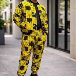 Stylish yellow and black patterned jacket and pants set. Eye-catching design perfect for any occasion.